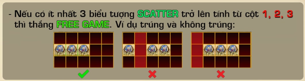 Kết quả có 3 biểu tượng Scatter trở  lên tính từ cột đầu tiên sẽ nhận được vòng quay miễn phí Free Game. Ví dụ trúng và không trúng: