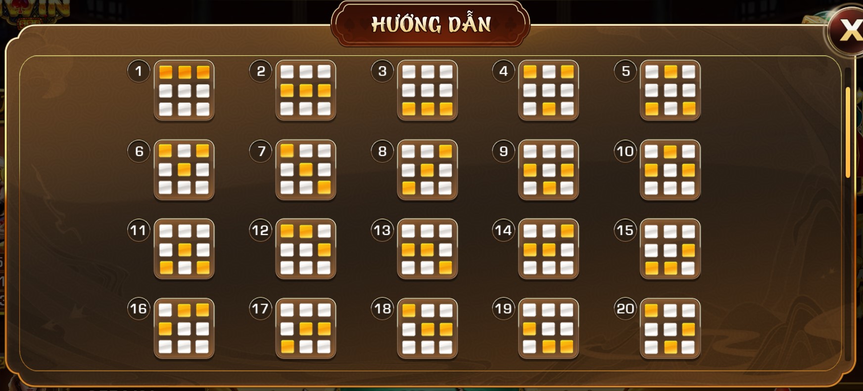 Mini Slot Phúc Mãn Đường thuộc thể loại slot chọn dòng, người chơi có quyền chọn bất kì dòng nào mình thích để xét tổ hợp. Tuy chỉ là mini game nhưng Phúc Mãn Đường có hẵn hoi 3 mức cược tương đương với 3 mức hũ khác nhau: