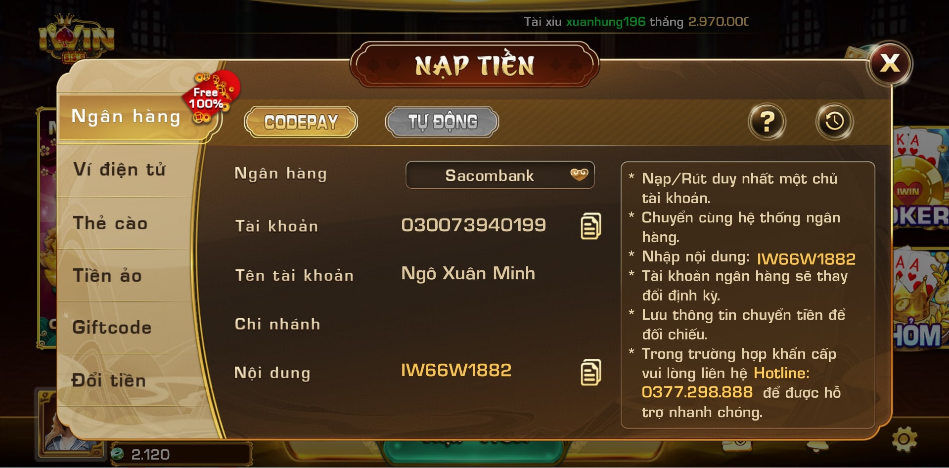 Tại iWIN các hình thức nạp đã được giản đến mức tối ưu, để lượt bỏ các bước lập lệnh rườm rà, dễ sai thông tin. Nên phương pháp nạp chuyển khoản truyền thông đã được loại bỏ tại cổng game này, thay vào đó là các hình thức nạp tự động như Codepay, Smartpay, Momo Codepay, hoặc thẻ cào. Các hình thức này chỉ yêu cầu người chơi điền đúng thông tin khi chuyển tiền, hoặc theo tác trực tiếp trên ứng dụng game 1 lần duy nhất. Tiền luôn được cập nhật vào tài khoảng trong vòng 3 phút ngay sau đó. Về phần rút, tiền cũng sẽ được chuyển về ngân hàng trong vòng 15 phút ngay sau đó, nếu bạn rút trên ngân hàng chính chủ.